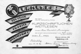 | 1933 | Auch die "Stenografen-Vereinigung Stolze-Schrey zu Oldenburg" stellt - unter dem Druck des NS-Gleichschaltungserlasses - auf die Deutsche Einheitskurzschrift um. |