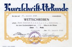 | 22.09.1945 | Wiedergründung als "Stenografen-Vereinigung Oldenburg (Oldb) e. V.". Zum Jahresende hat der Verein 65 Mitglieder. |