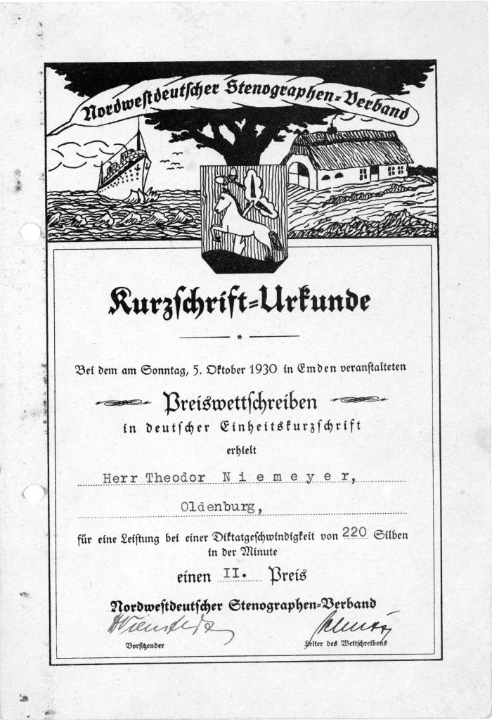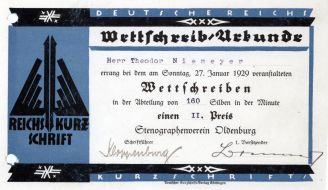 | 1933 | Auch die "Stenografen-Vereinigung Stolze-Schrey zu Oldenburg" stellt - unter dem Druck des NS-Gleichschaltungserlasses - auf die Deutsche Einheitskurzschrift um. |