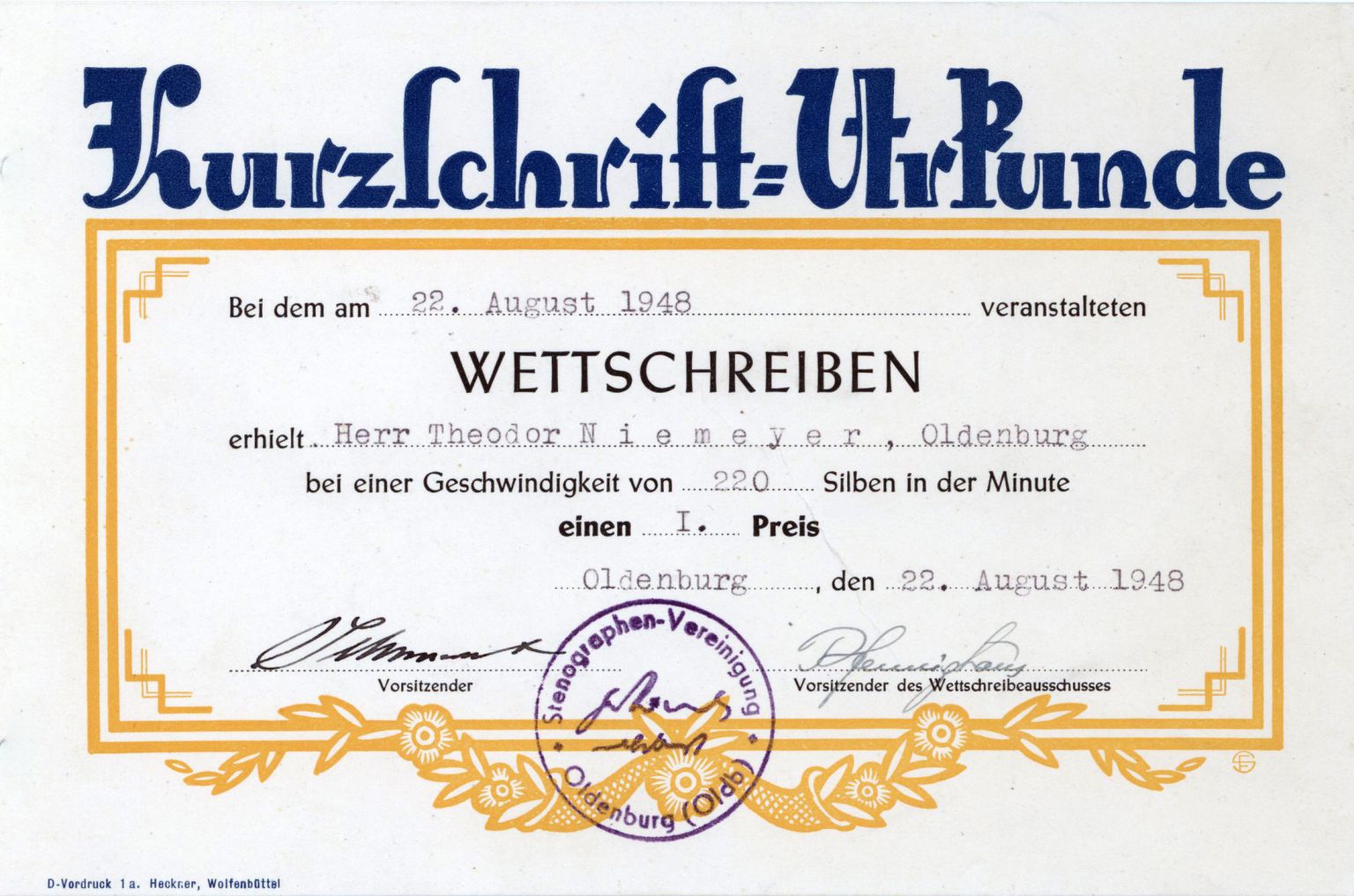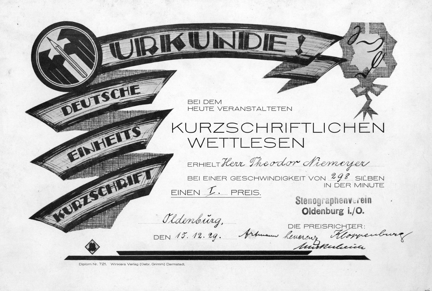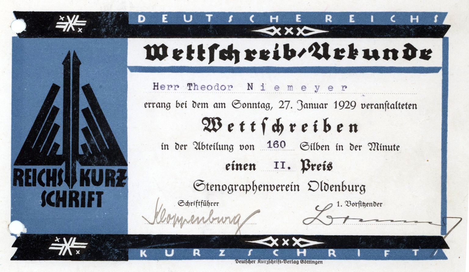 | Der Stenografenverein Oldenburg (der ehemalige Gabelsberger-Verein) fungiert nach der Auflösung des Deutschen Stenografenbundes als Ortsgruppe der Deutschen Stenografenschaft im NS-Lehrerbund. | |